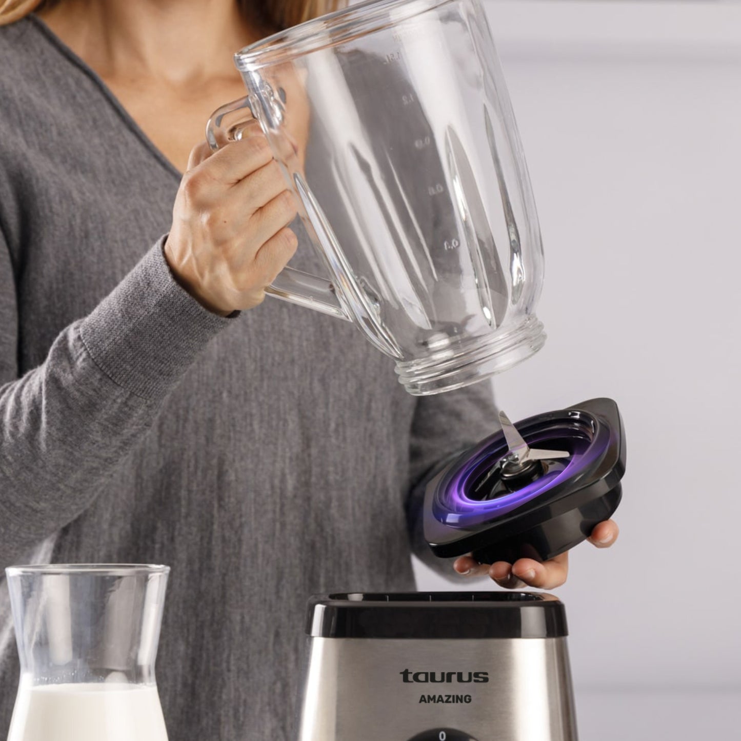 The Amazing JB1502XC blender by Taurus combines 1500W of power with a 1.5L graduated glass jug and removable stainless-steel blades, perfect for crushing ice and preparing shakes or smoothies. With 2 speeds, Turbo function and a safety system that activates the blender only when the jug is properly in place, it is both practical and reliable. Its dishwasher-safe parts, pouring spout and non-slip feet make this blender an essential tool for your kitchen.