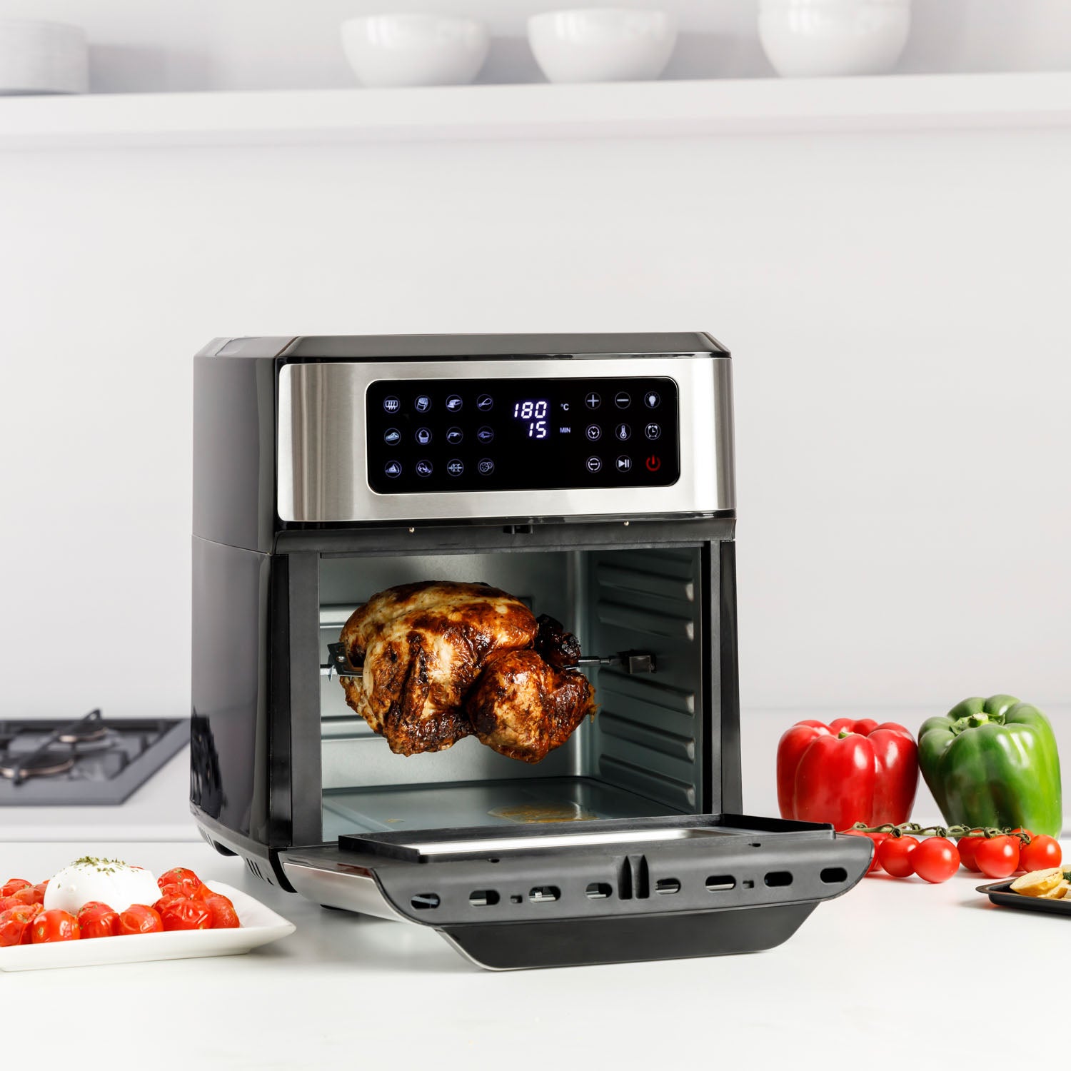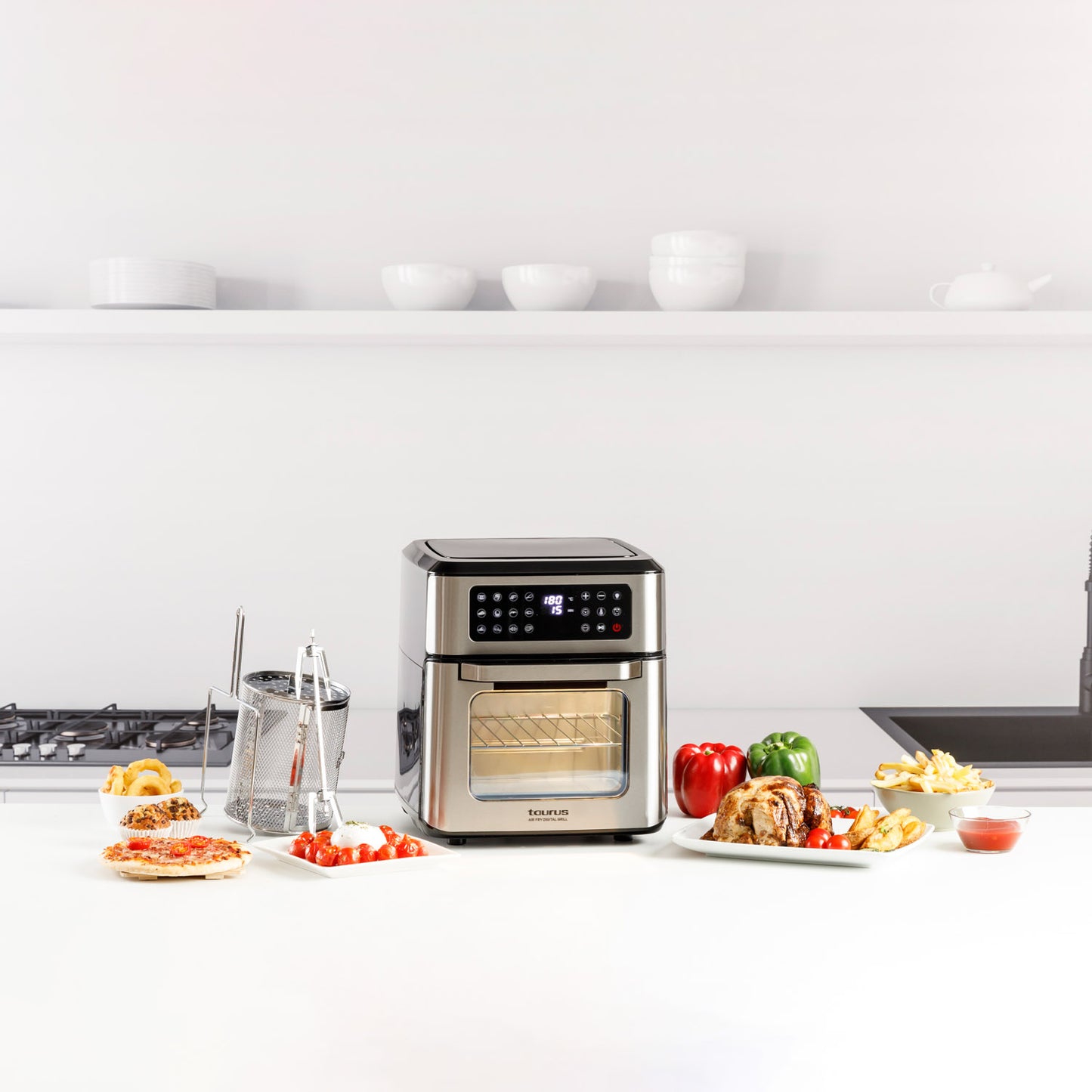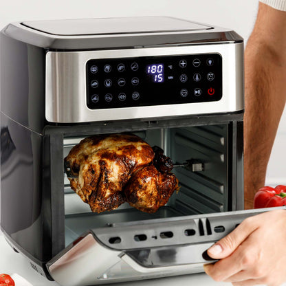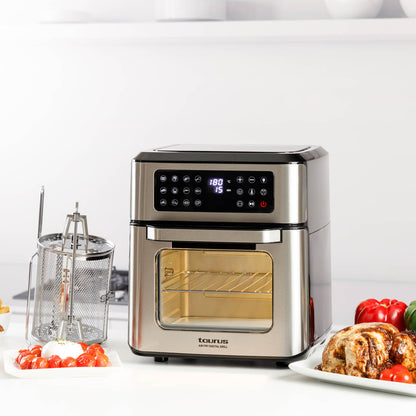 - Vários acessórios incluídos: bandeja de resíduos, 1 grade, garfo para espeto, cesto giratório para fritura e alça