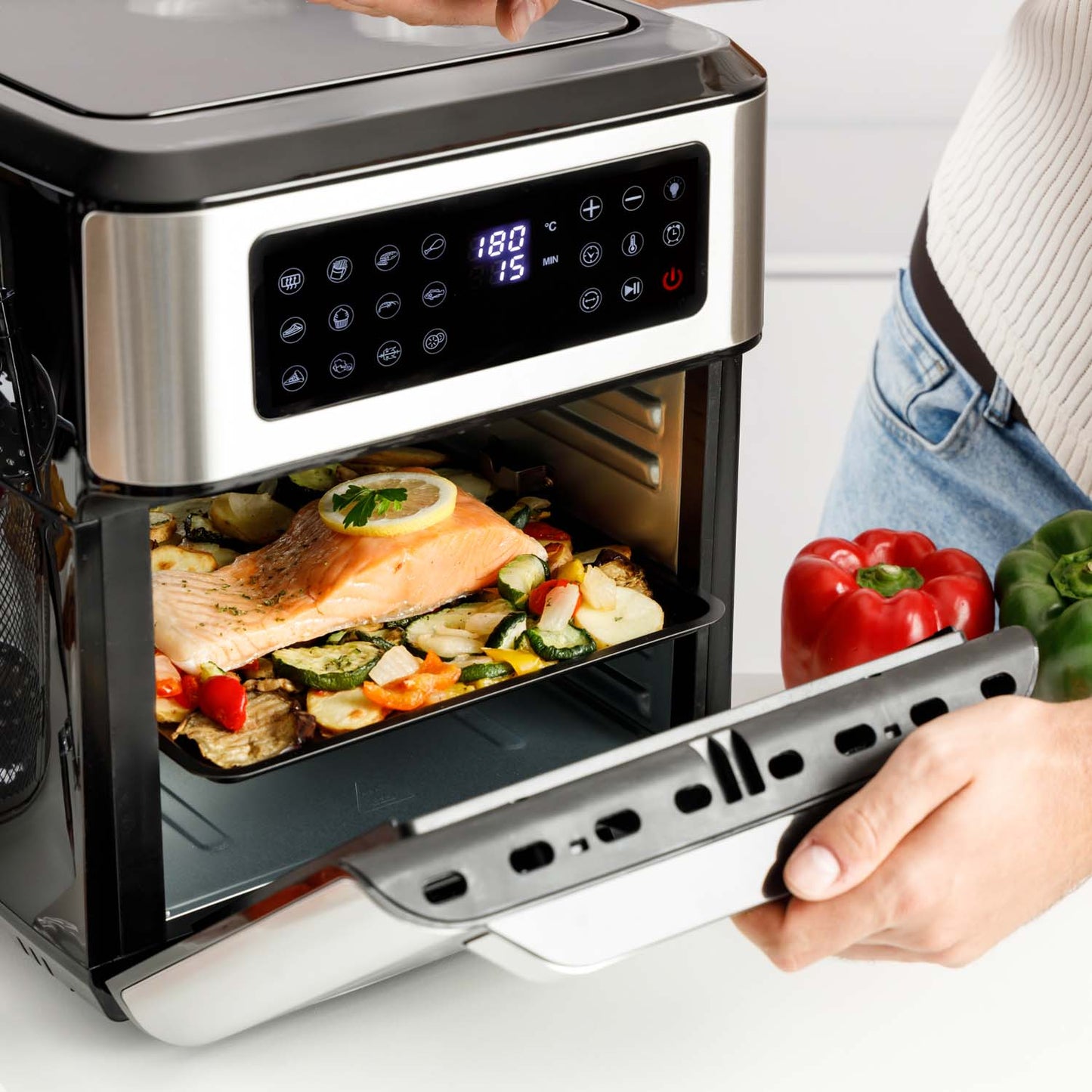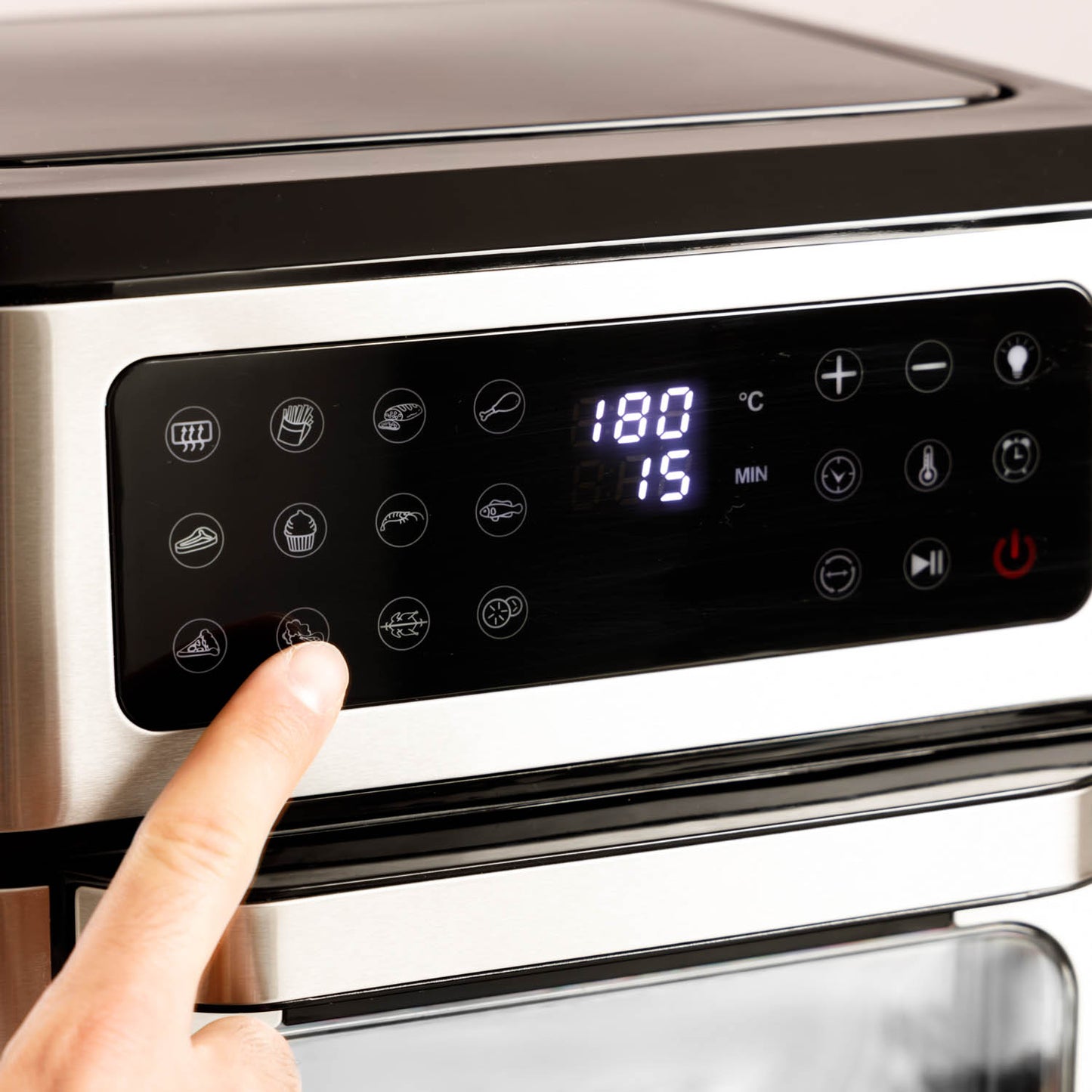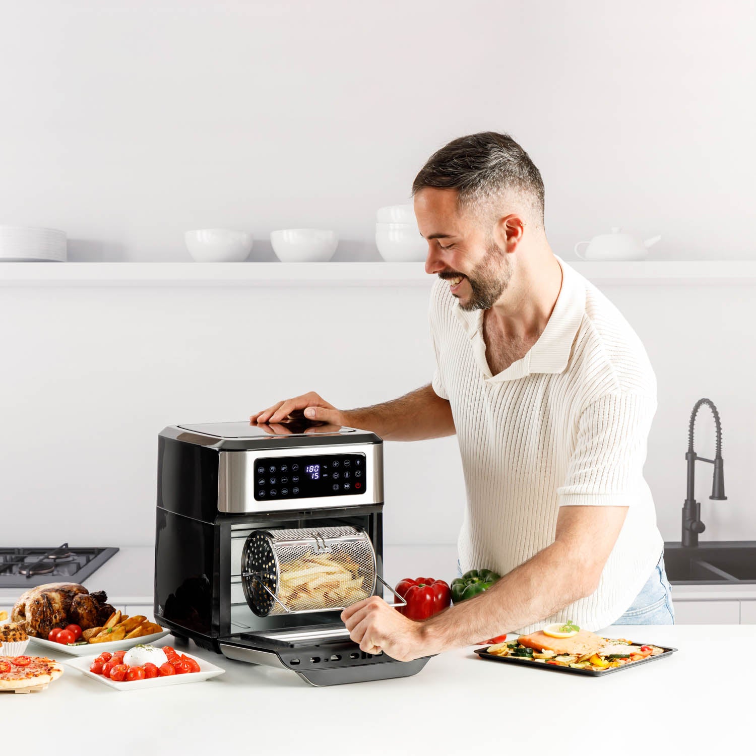 - Comece a cozinhar com apenas um toque usando o painel digital com 12 programas pré-definidos: Pré-aquecer, batatas, carne, coxas e asas de frango, bife, confeitaria, frutos do mar, peixe, pizza, legumes, frango inteiro e desidratar